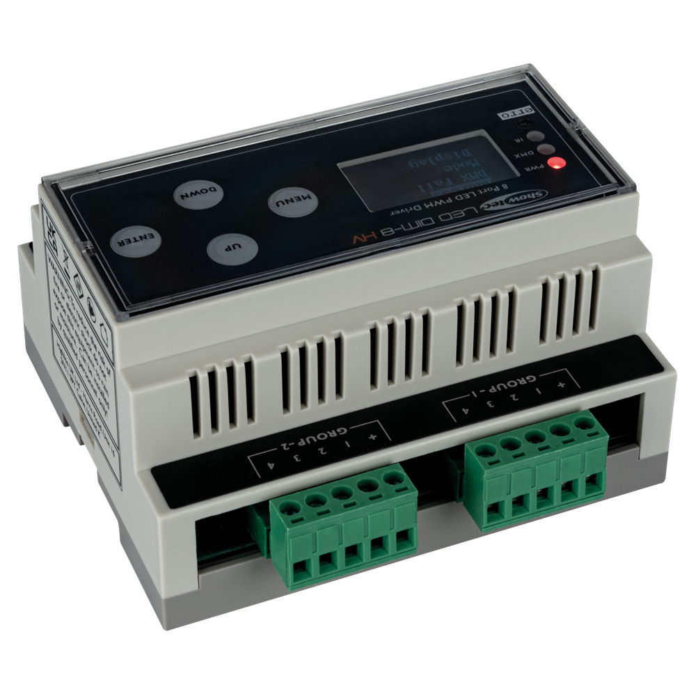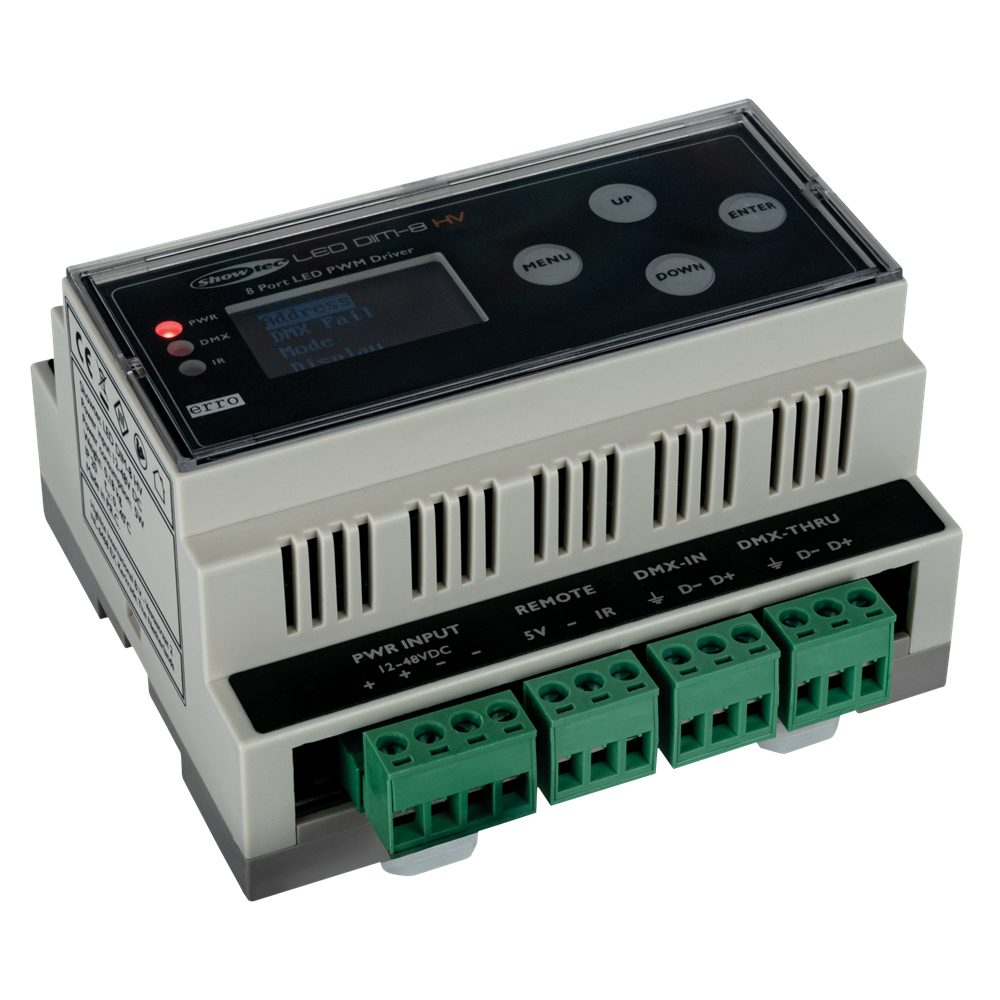 Showtec LED Dim-8 HV er højspændingsversionen af Showtec LED Dim-8 Install og den ideelle kompakte fastmonterede PWM-dæmper for lange RGBW LED-striber. Den tilbyder to grupper af 4 udgange til RGBW-styring med en maksimal udgang på 8A per gruppe, 16A i alt. Alle forbindelser er nemme at lave ved hjælp af plug-in Phoenix terminaler. LED Dim-8 HV er meget brugervenlig og universelt konfigurerbar til forskellige LED-striber. Den kan styre 12 V til 48 V konstant spændingstriber via DMX eller som en selvstændig controller for enkelte scener og jagter. Brugerfladen er meget nem med en højkvalitets O-LED skærm. Den DIN-skinne monterede LED Dim-8 er ideel for netværkede system integration projekter.