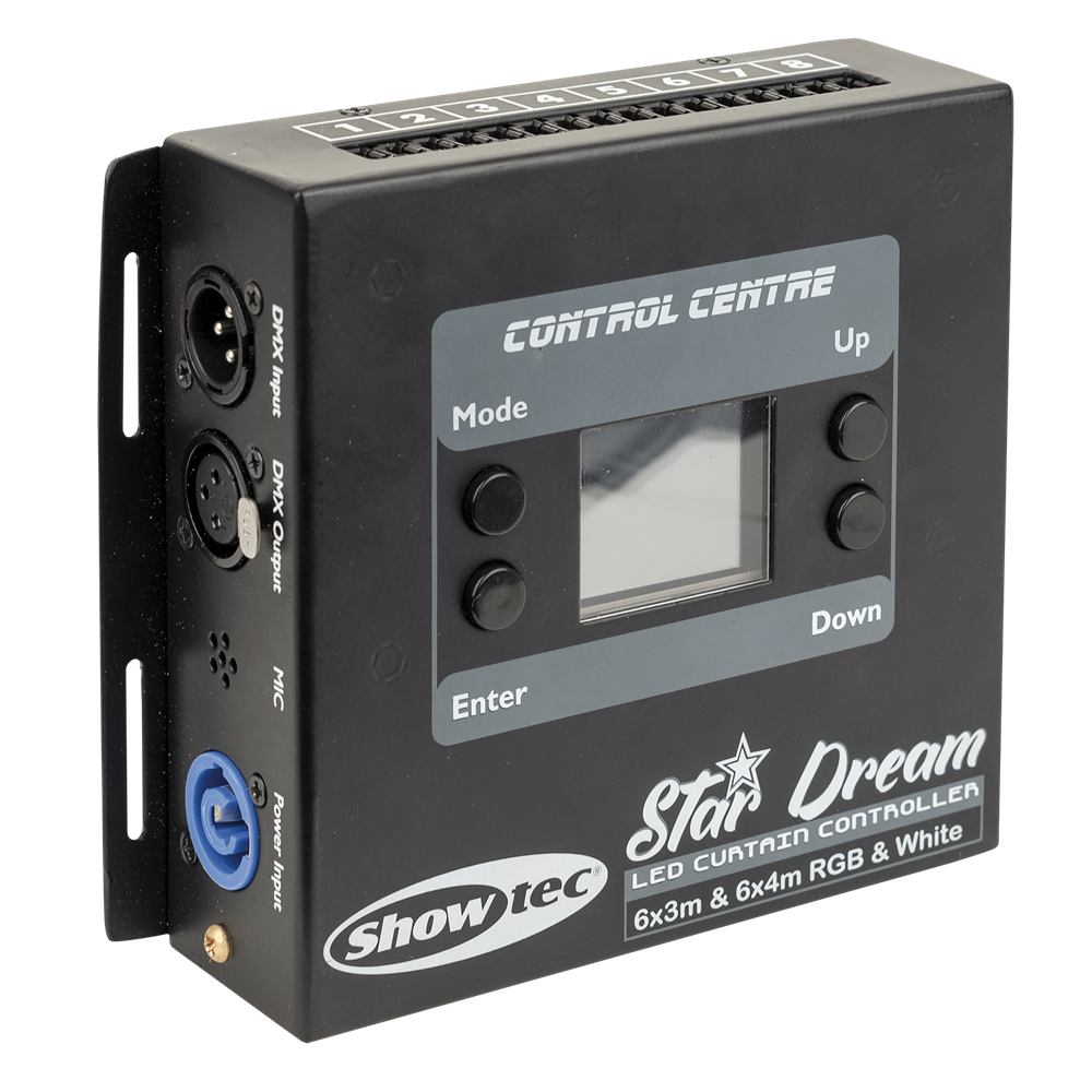 The Showtec Star Dream is a black molton cloth with built-in LEDs (8 groups) and LED controller to create a starry sky. It is available in different sizes and LED types (white and RGB). It is also fully compatible with Wentex Pipe and Drape. The backdrop curtain is equipped with hook and loop and eyelets. The Star Dream has several operating modes such as Auto, Sound and Master/Slave. Control via DMX is also no problem (3-pin XLR in- & out).