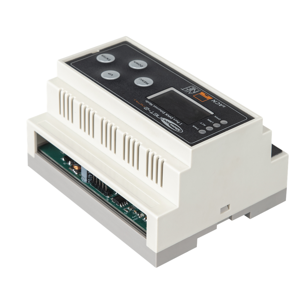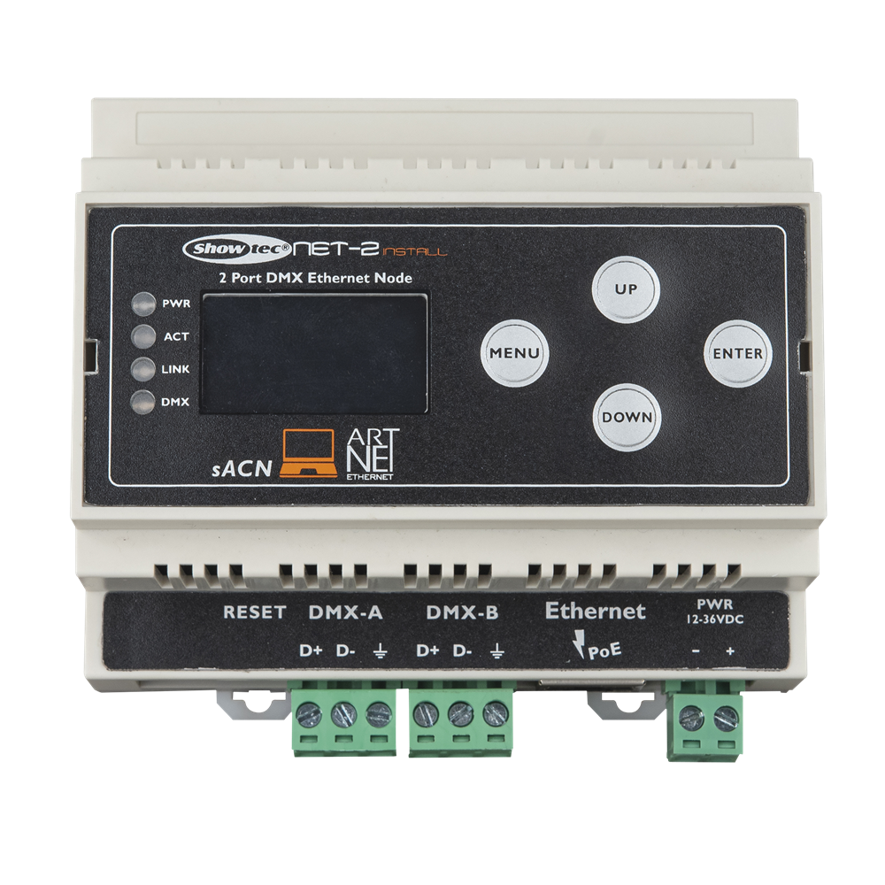 Showtec NET-2 Install er det ideelle kompakte fast-installationsnode til dig. Alle forbindelser er let tilsluttelige med plug-in Phoenix-terminalerne, og begge bi-directional DMX-porte er optisk isoleret for at forhindre nogen forstyrrelser i at overtage dit signal. Strøm kan leveres via PoE eller på den brede DC strøm indgang. Der kan transporteres et maksimum af 1024 kanaler over en enkelt CAT5. Alle indstillinger kan foretages via den let-at-bruge menu på det grafiske display og knapperne på front eller via den fjern-webinterface, der kan tilgås indenfor netværket. Standard login konto: Admin, kodeord: Admin. Den DIN-skinne monterede NET-2 konverterer Art-Net eller sACN til DMX512 og tilbage, og er ideel til netværks system integrationsprojekter.