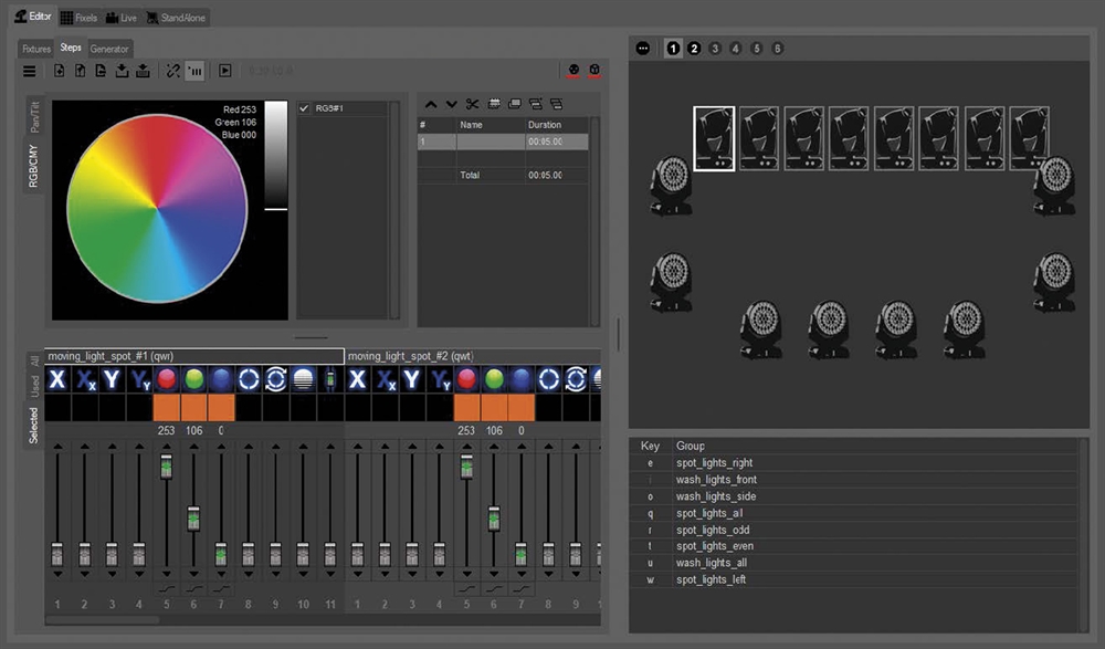 Softwaren indeholder flere visninger: Editor, Pixels, Live, Stand Alone. Hver visning har sine egne dedikerede faner for direkte adgang til alle nødvendige funktioner og indstillinger.