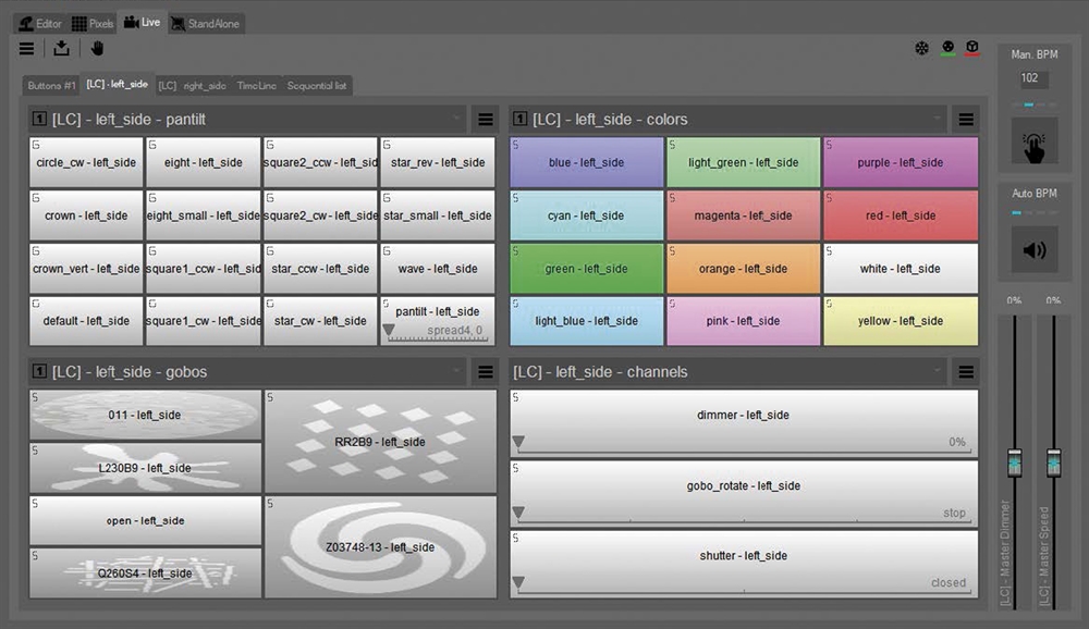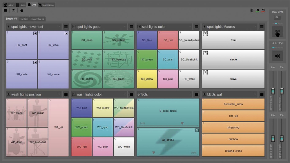 I Live kan du afspille og tilpasse showet efter behov (sider, knapper, præindstillinger). Knapper kan laves til farver, bevægelseseffekter, men kan også udløse en komplet lysscene eller tidslinjemultimediafil. Under live-drift er det muligt at tilsidesætte med Editor.