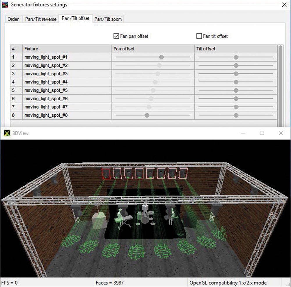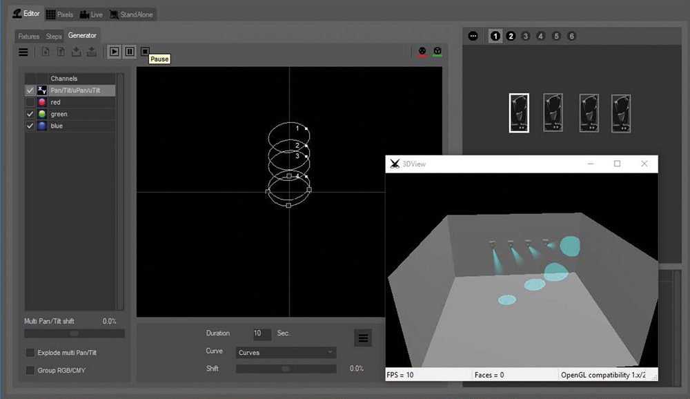 I Generator kan du bygge komplekse lysscener med få klik, det kan håndtere pan/tilt-bevægelser, farver, gobo og effekter for en gruppe bevægelige lys med delay-effekter. Den har forudindstillede former dedikeret til dimmere, bevægelser og farver.