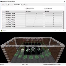 Med 3DView kan du vise scenen i 3 dimensioner, og det viser lysene bevæge sig i realtid fra alle vinkler. Indstil scenestørrelse og placer objekter og lysarmaturer. Programmet har en bank af grundlæggende objekter (højttalere, truss, musikinstrumenter m.m.). Du kan også importere dine egne objekter. Indstil position for hvert objekt (eller armatur). Det er muligt at indstille disse parametre på en gruppe objekter. Sæt teksturer, lysstyrke, røg niveau for mere realisme.