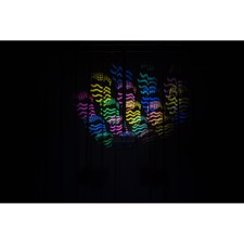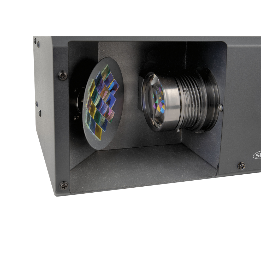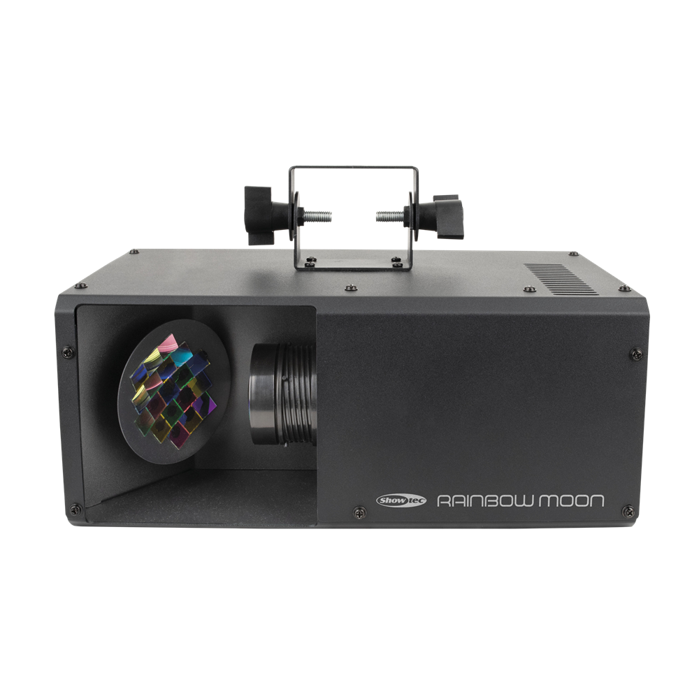 Rainbow Moon har en bred strålevinkel på 75°, dikroiske spejle på spejldisken og 12 indbyggede mønstre. Sammen skaber de smukke, farvede stråler, der er ideelle til lokaler med lave lofter eller hvor projektafstanden er kort. Den 100 W varme hvide LED lyskilde genererer rigelige mængder lys.