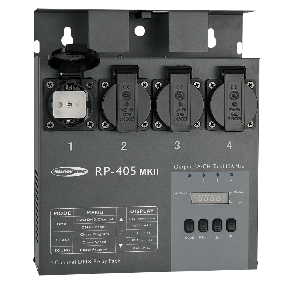 The Showtec RP-405 MKII is a relay pack with built in relays and is very suitable to switch your LED lighteffects. As common relaypacks are not suitable to switch the low power of LEDs, this RP-405 MKII is the right solution.