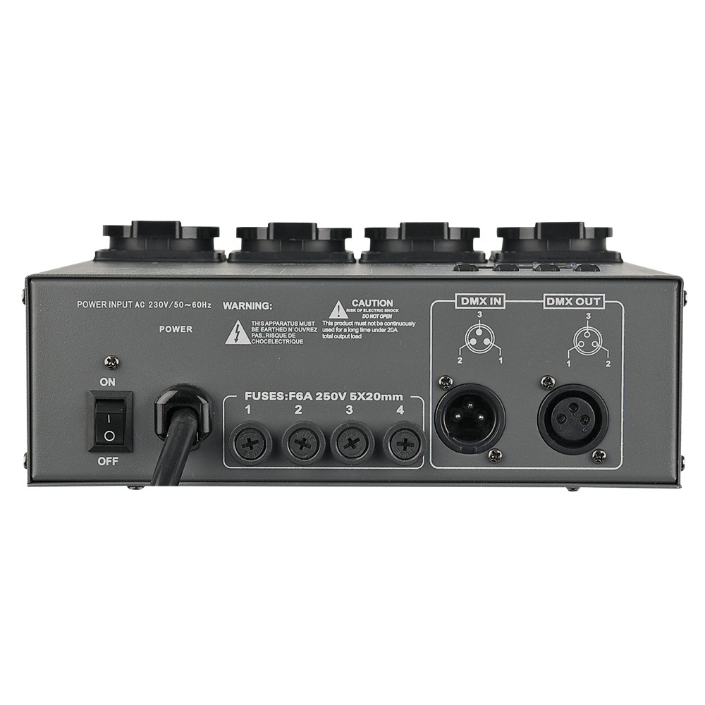 The speed of the patterns is adjustable between 20 seconds up to 2 minutes per step which makes this relay-pack very suitable for small venues because there is no need for an external controller.