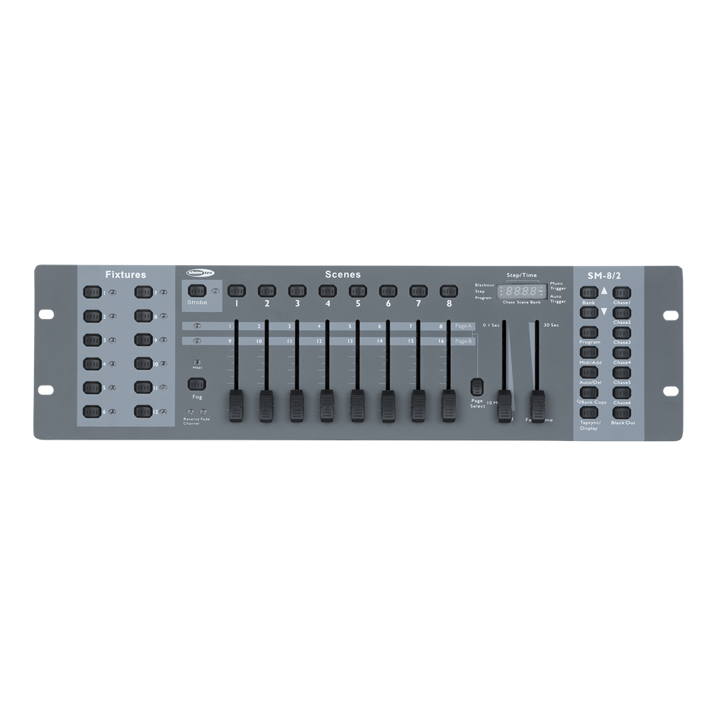 SM-8/2 er en ideel begyndercontroller til brug med intelligente lamper på op til 16 kanaler. Den har 8 fadere, som kan styre 16 kanaler på 2 sider. Op til 12 armaturer kan vælges og programmeres. Enhver kanal kan patches til enhver fader, og den kan programmere 250 scener og 6 jagter.