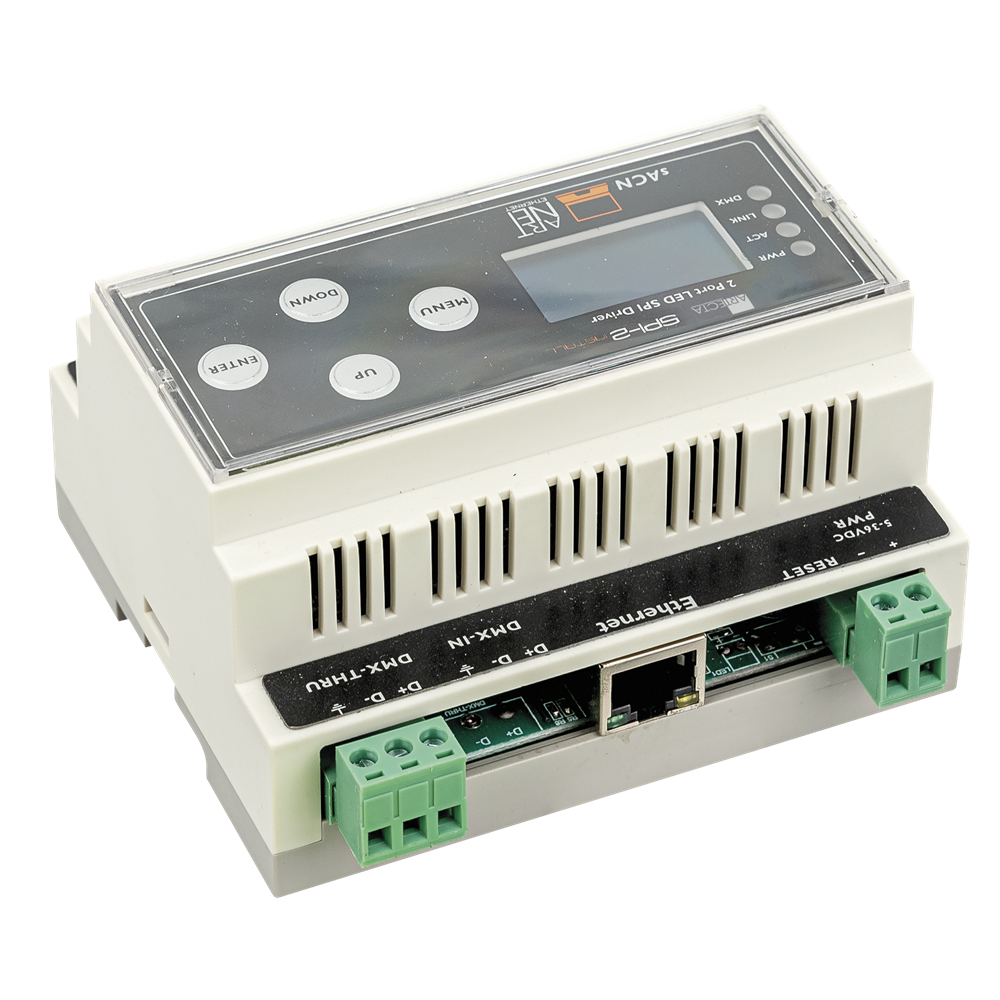 Showtec SPI-2 Install er en kompakt SPI-controller til dine digitale LED-strips. DIN-skinnehuset er ideelt til faste installationsformål. Alle forbindelser er nemme at forbinde med stikbare Phoenix-terminaler. Brug simpelthen DMX, Art-Net eller sACN til at styre de mest almindelige typer af LED'er (WS2811, WS2812B, PSK6812, P943, UCS9812). Alle indstillinger kan foretages via det nemme at bruge menuen på det grafiske display og knapperne på fronten eller via det fjernbetjente webinterface, som kan tilgås inden for netværket. Hver gruppeudgang kan håndtere op til 960 pixels. Det DIN-skinne monterede SPI-2 konverterer DMX, Art-Net eller sACN til SPI og er ideelt til netværkssystemintegrationsprojekter.