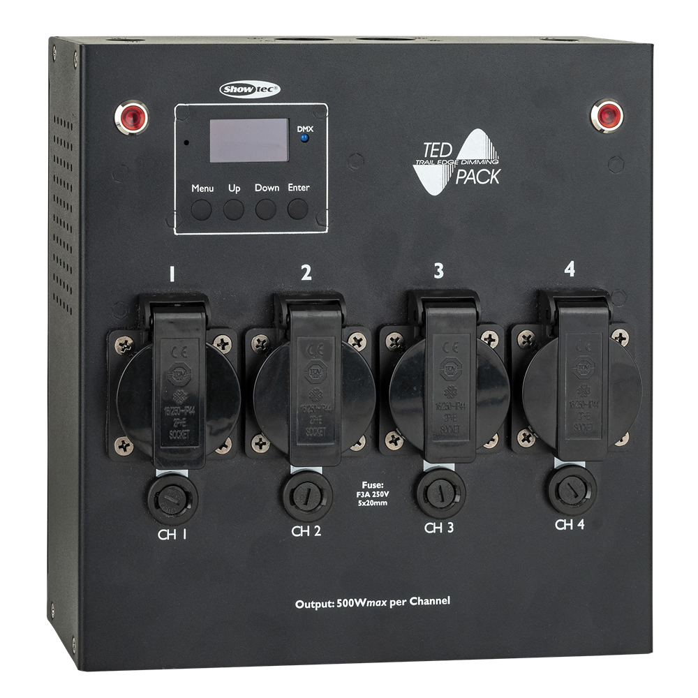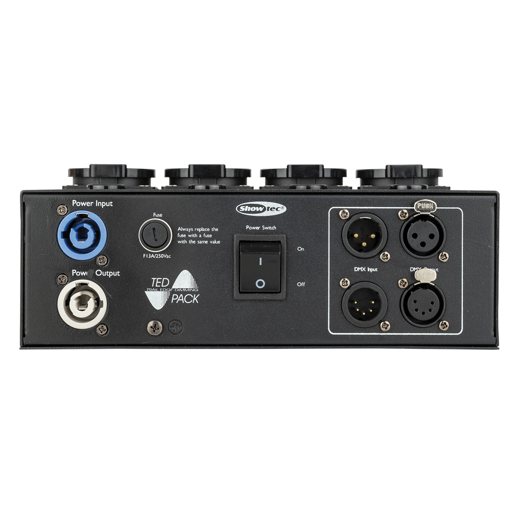 TED Pack er en 2000 W førende og efterfølgende kant 4-kanals dæmper til indendørs brug med dæmp, skift og FX modes. Udgangen er uafhængig af den tilsluttede belastning og kan bruges med LED'er og glødepærer op til 2 A pr. kanal. Dens kanaler kan være forbundet eller styres individuelt. TED Pack bruger MOSFET'er til at dæmpe udgangen og kan skiftes mellem førende kant og efterfølgende kantdæmpning. Special FX-tilstand tilbyder en sikkerhedskanal, der forhindrer utilsigtet aktivering, hvilket kan være nyttigt til at kontrollere skydere, kanoner, dråber, et cetera. Enheden kan styres manuelt og via DMX. Den medfølgende Quicklock-beslag klikker nemt på fra bagsiden eller toppen.