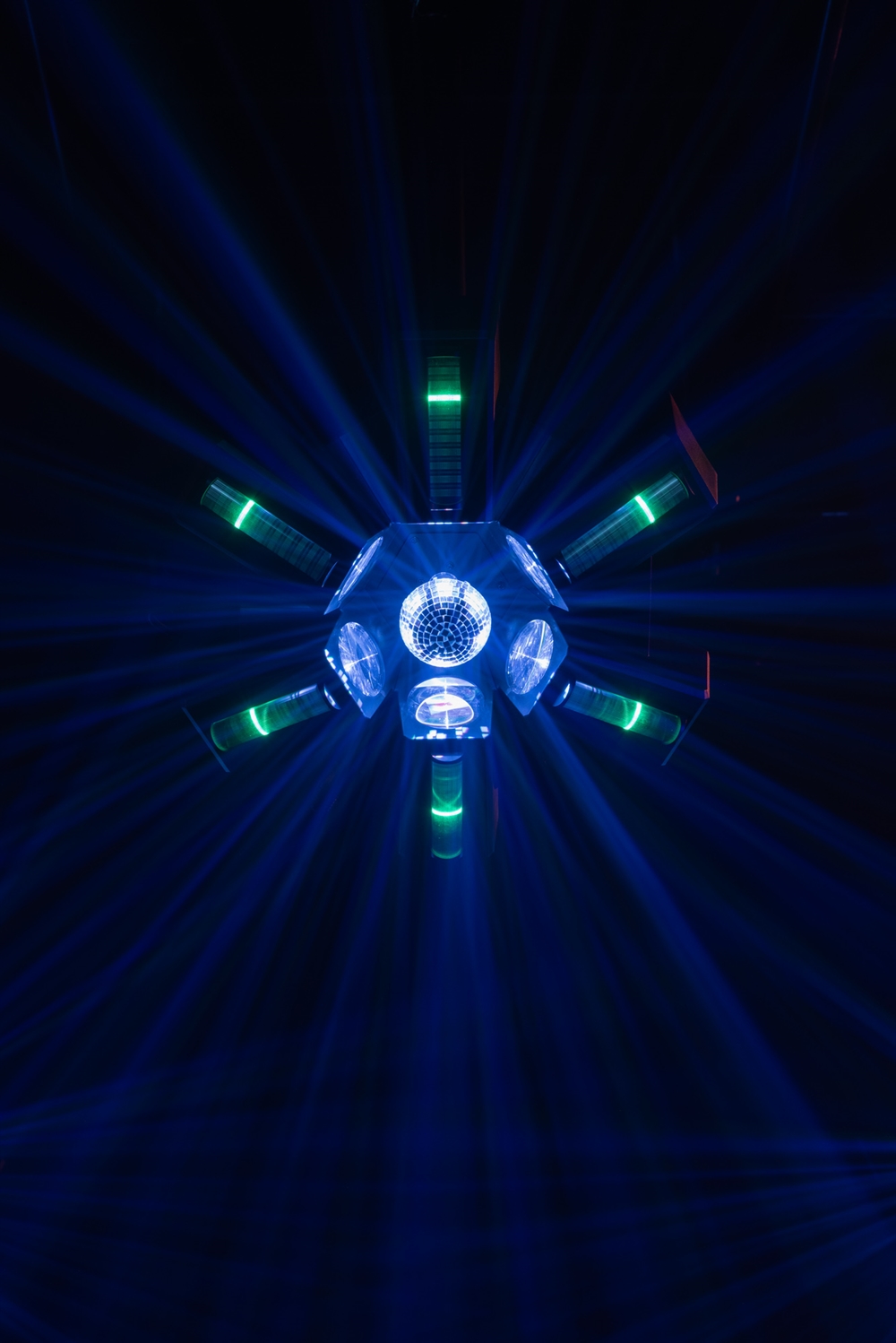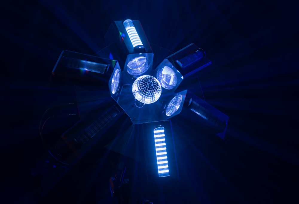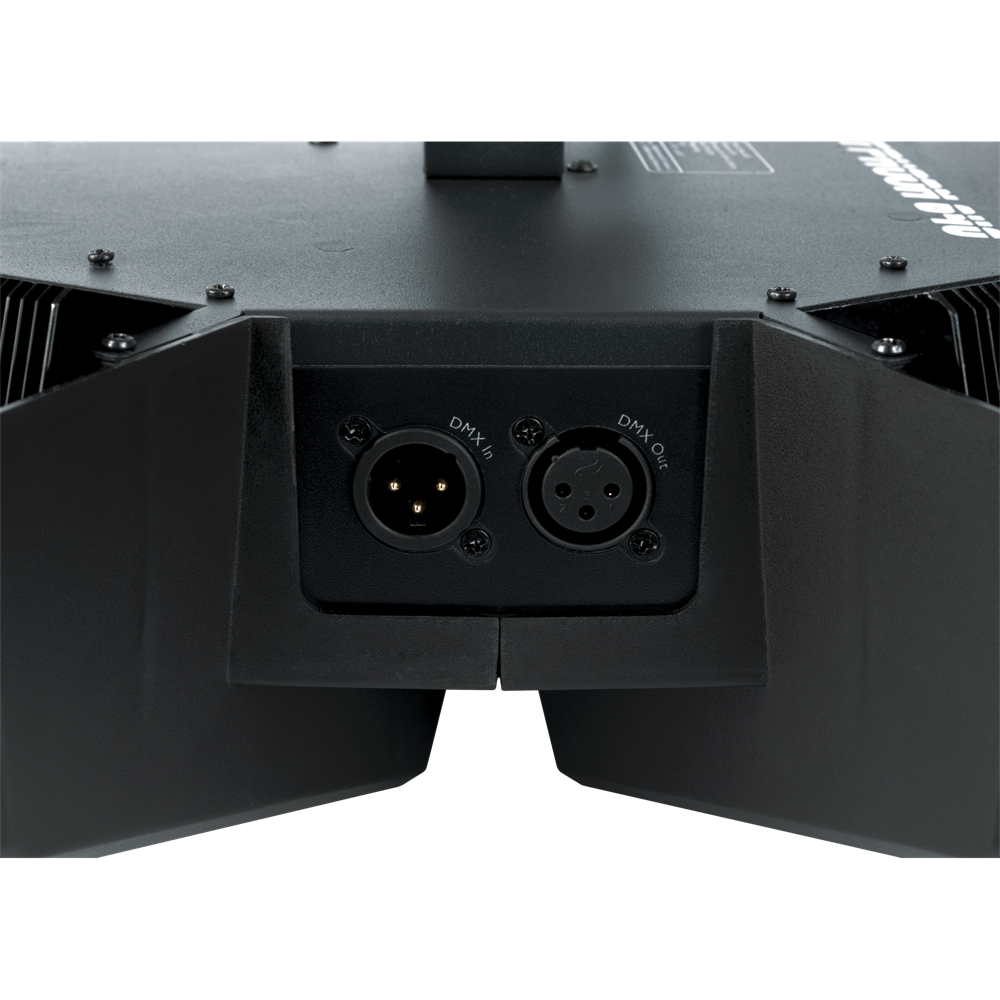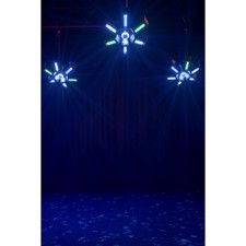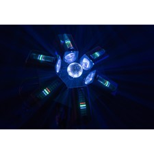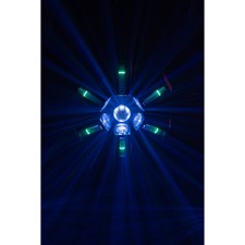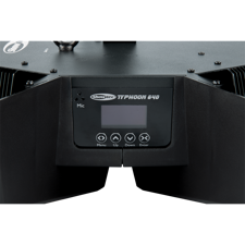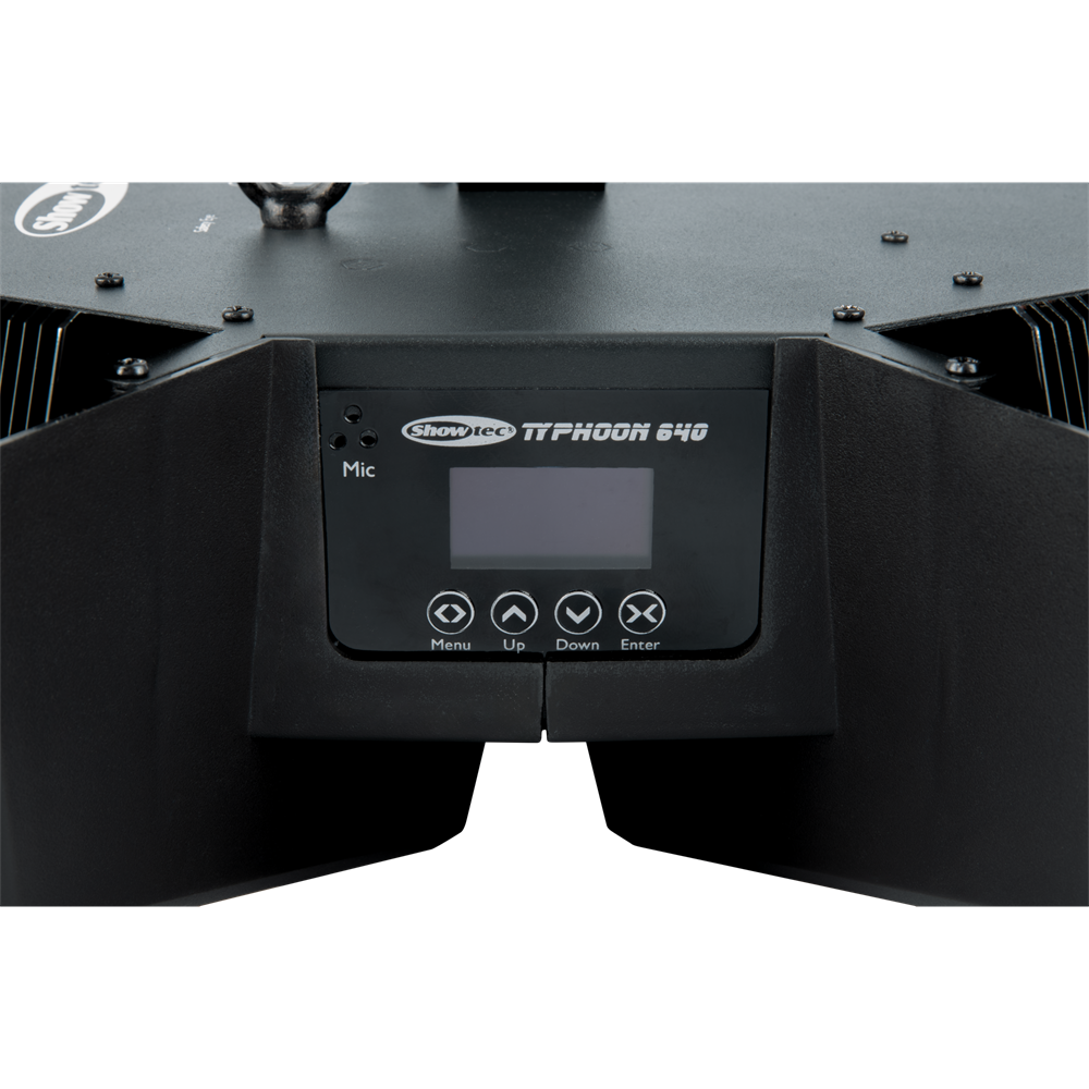 Showtec Typhoon 640 er en unik lyseffekt, der anvender seks cirkulære 40W RGBW-LED'er, der peger indad mod en centralt placeret roterende halv spejlkugle. De seks RGBW-LED'er kan styres individuelt, og hastigheden og retningen af den halve spejlkugle kan styres for at skabe unikke, farverige spejlkuglemønstre. Hver af de seks RGBW LED-huse indeholder også en RGB LED-effektstrimmel, som kan styres individuelt, men som også kan vise forskellige shows, der kan vælges for at vise underholdende mønstre og effekter. Den er konvektionskølet for lav støj.Typhoon 640's lave profil og brede strålevinkel gør den ideel til rum med lave lofter, men den kan også monteres lodret (eller i enhver anden vinkel) for kreative effekter og blændende spejlkugle glimt. Den har DMX-tilstande med 4, 16, 31, 36 og 51 kanaler, men kan også køre selvstændigt og lydaktiveret.