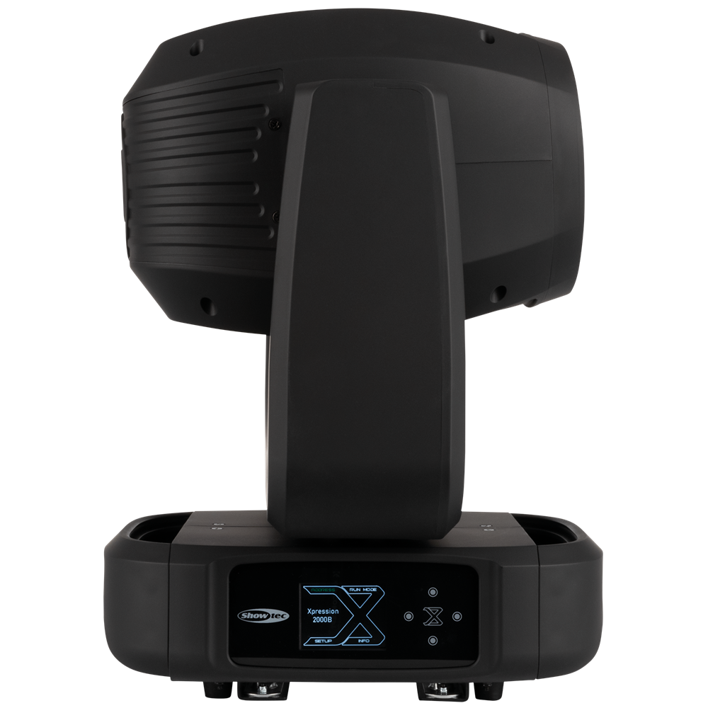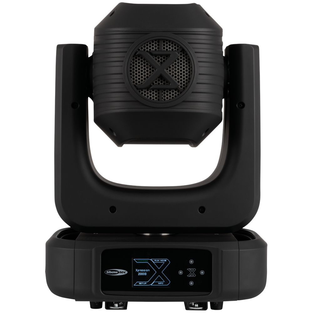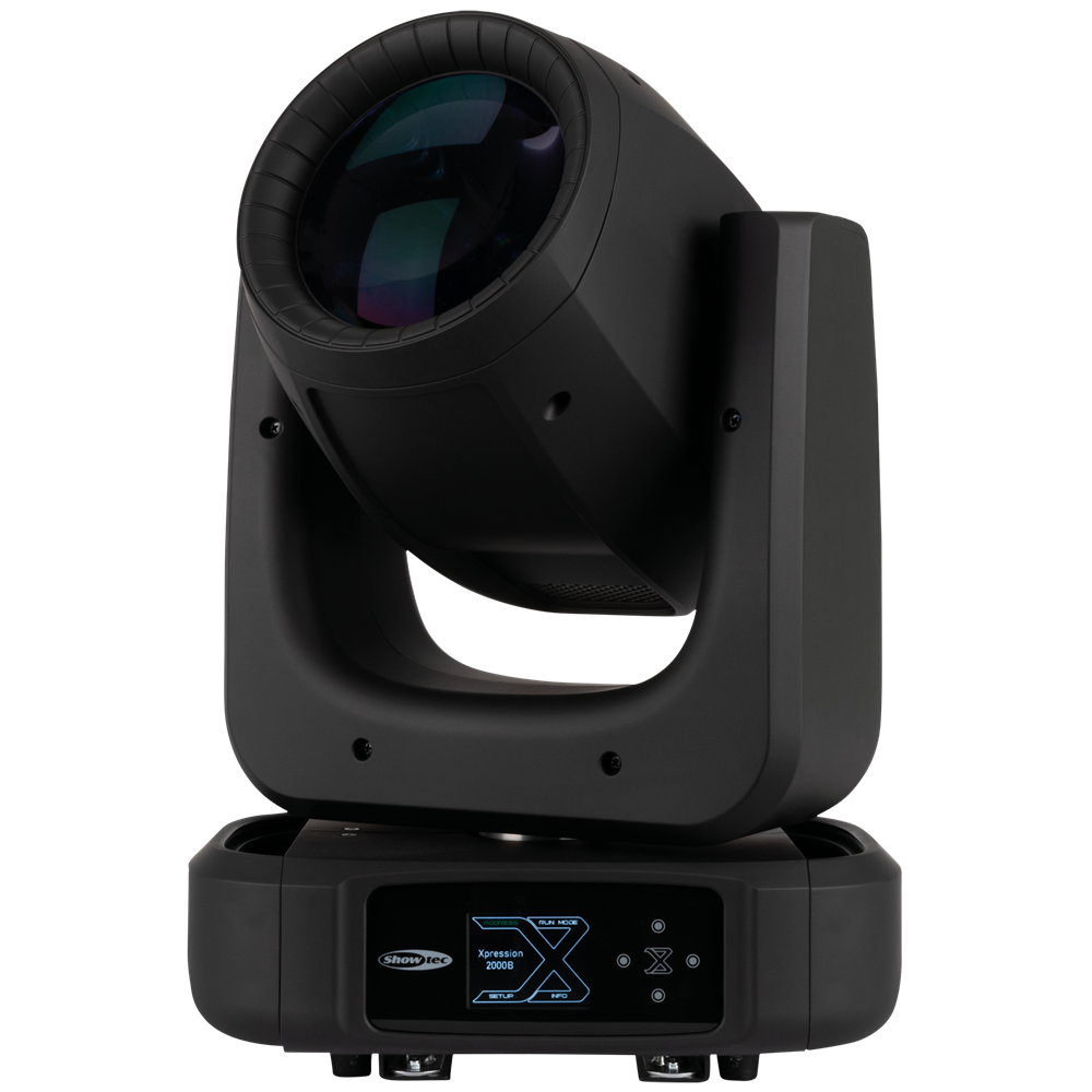Showtec Xpression 2000B - Beam er en lysstærk, medium stor LED bevægeligt hoved med en strålevinkel på 2°, en stor linse (12,5 cm) og en effekt på 2392 lumen, velegnet til indendørs steder. Den har et dichroisk farvehjul med 14 farver + åben, et metal gobo-hjul med 13 gobos + åben, og dobbelte cirkulære prismer med 8 og 48 facetter, der kan lægges oven på hinanden og roteres for dynamiske effekter som en moonflower-effekt. Andre funktioner inkluderer en frost-effekt, motoriseret fokus, præcis 16-bit-pan og uendelig tilt og justerbar PWM (1.200 - 15.000 Hz). Alle farve- og gobo-effekter er perfekt matchet i hele Xpression-serien, hvilket sikrer problemfri integration med andre dele i serien.