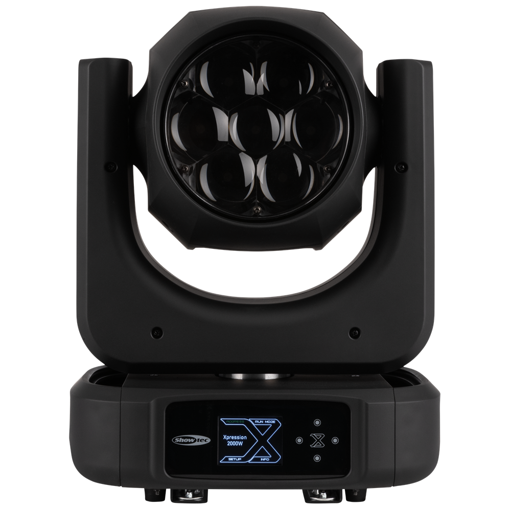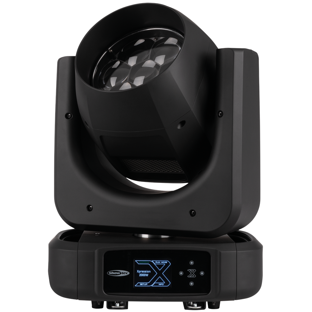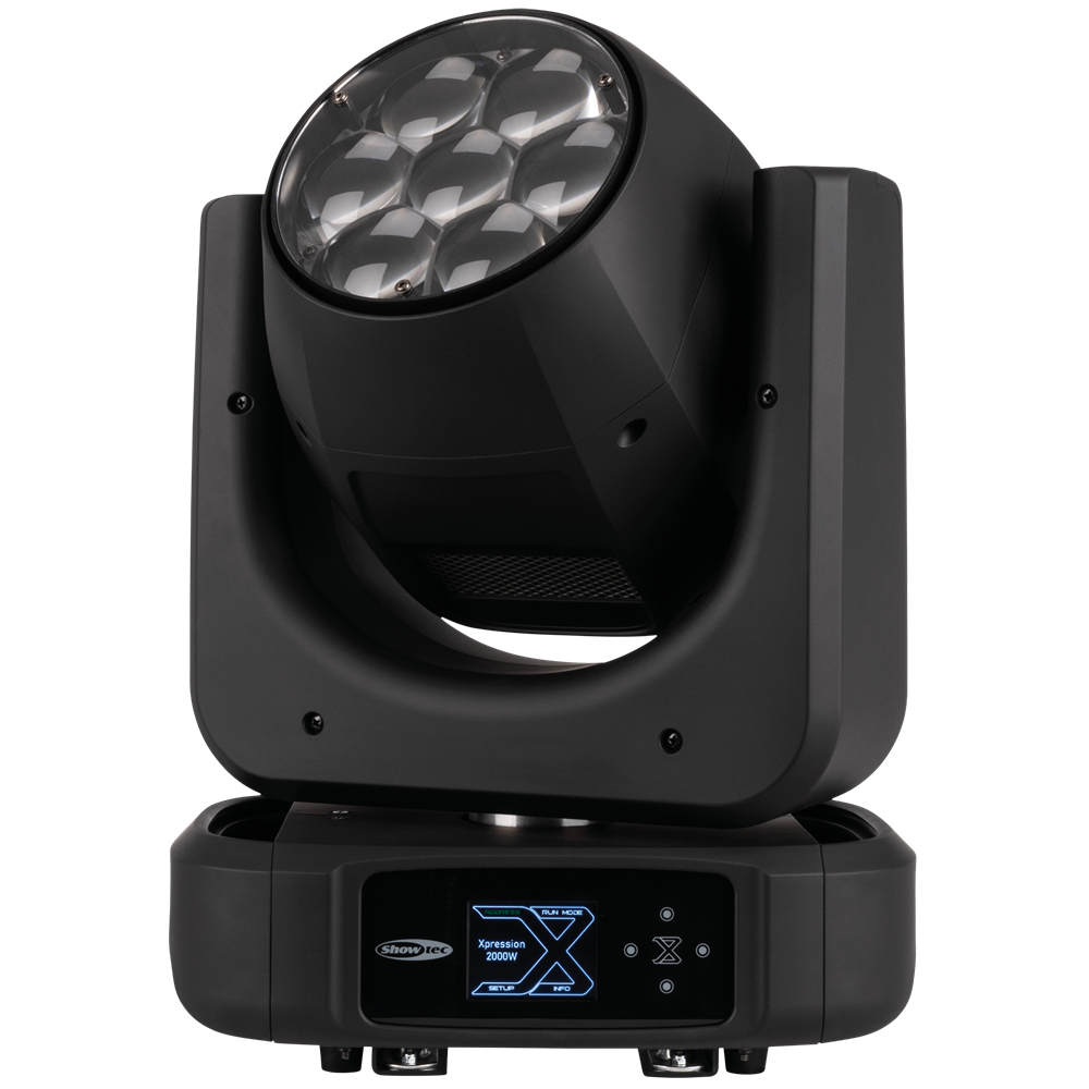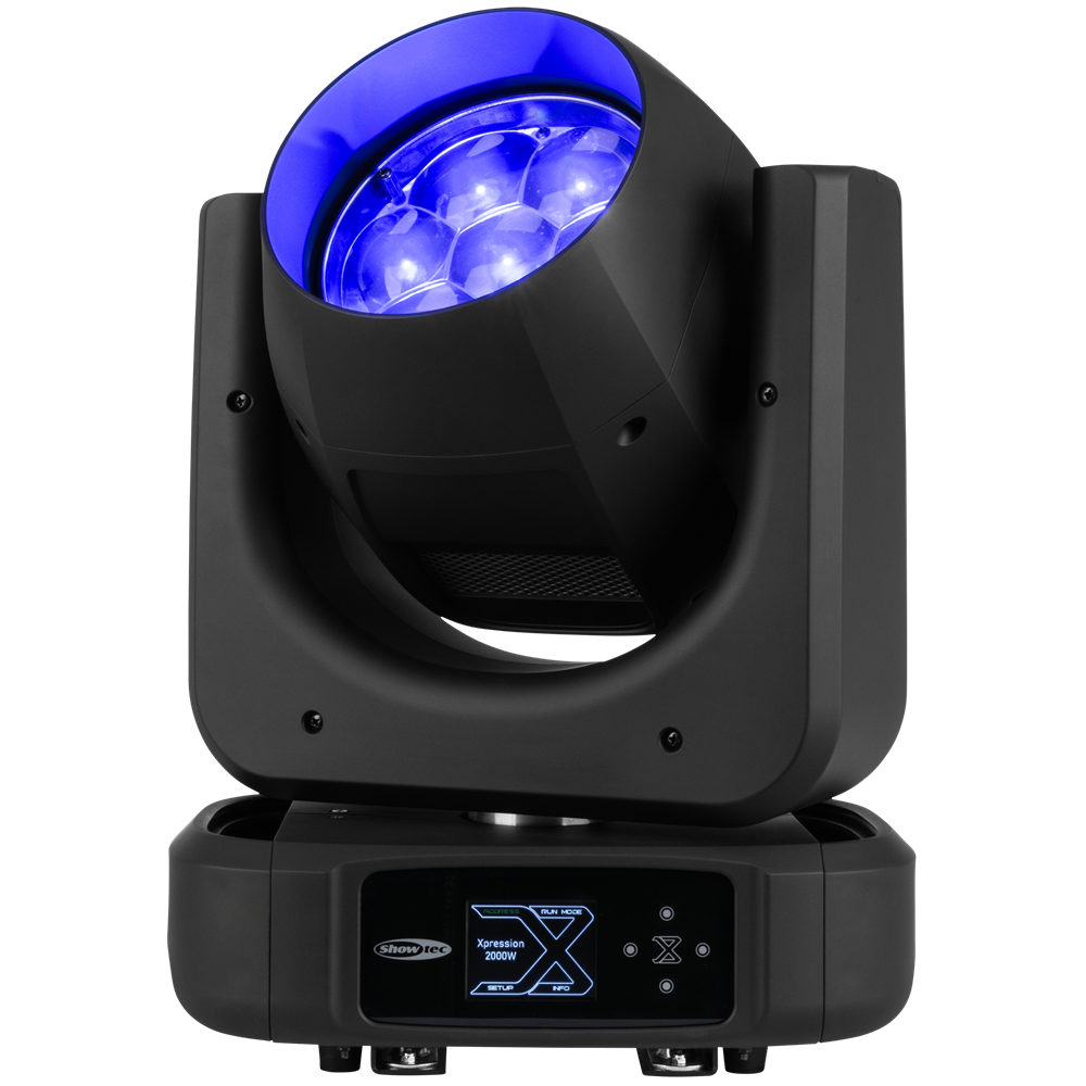 Showtec Xpression 2000W - WashBeam er et lyst, mellemstort LED bevægeligt hoved med en justerbar strålevinkel mellem 3,8° og 35°, og en output på 3166 lumen, der er passende til indendørs steder. Den har syv 40-watt RGBW-LED-pærer, motoriseret zoom, præcis 16-bit pan og uendelig tilt, samt justerbart PWM (1,200 - 15,000 Hz).