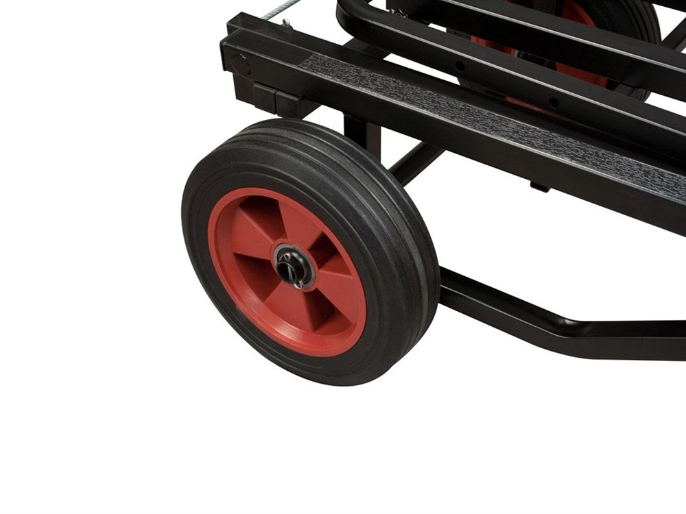 Versatile multifunction transport cart for loads up to 150 kgThe ROADINGER Stage Donkey XL is the perfect companion for your audio systems, guitars, DJ equipment and much more. It is the ideal transport assistant for your stage, in the studio or at events.The no-flat wheels are made of solid, shock-resistant material and the swivel front wheel is equipped with a brake for safe loading and unloading. The light steel construction with powder coating provides the necessary stability.You can fold the Stage Donkey comfortable and easy for transport and storage.The Stage Donkey can be used in a variety of ways, e.g. as a sack truck that can carry loads of up to 50 kg. For use as a transport trolley, the maximum load is 150 kg.