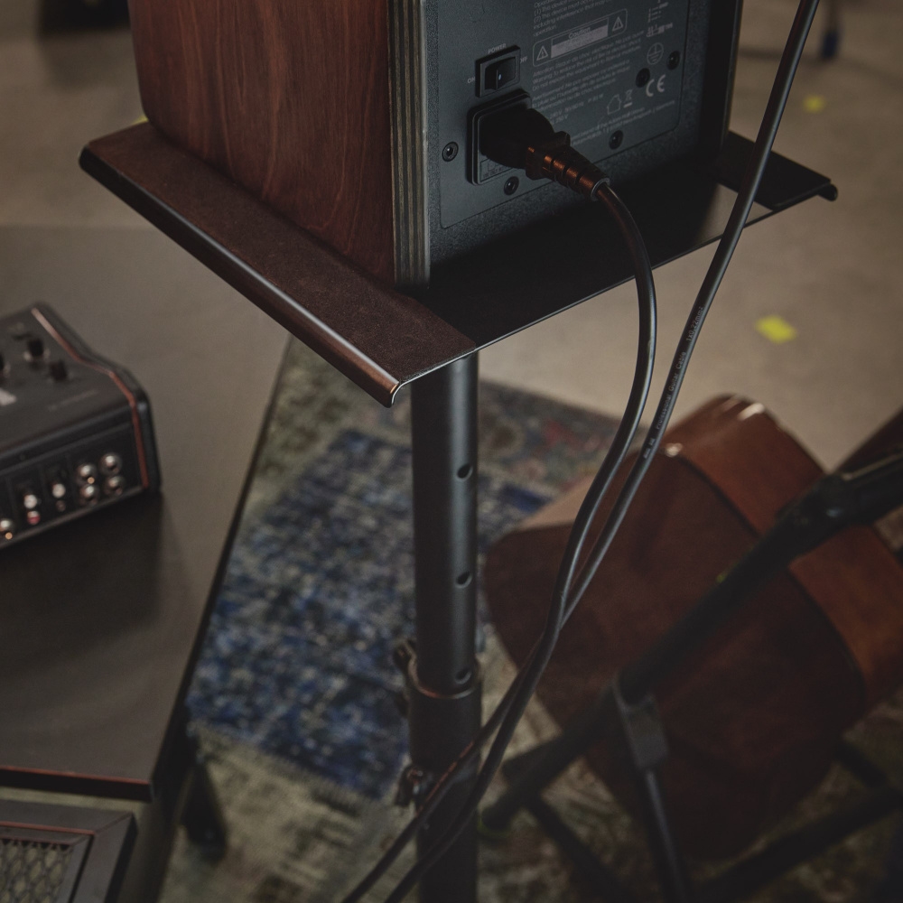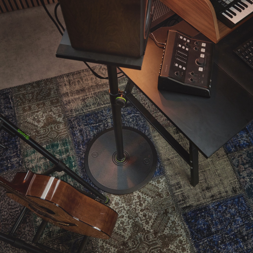 Gravity SP 3202 LRB studiemonitorstand har en rund støbejernsbundplade, der vejer 9 kg for en sikker stand og kan øges med yderligere 5 kg med den valgfrie WB 123 WPB-vægtskive, hvis det er nødvendigt. For optimal højttalerpositionering kan stativet nemt justeres i højden fra 860 mm til 1500 mm og låses fast med en justeringsskrue og en låsenål. Højttalerstøtten måler 250 mm x 250 mm og er udstyret med EVA for at beskytte og adskille studiemonitorerne for optimal lydpræstation.