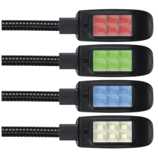 6 RGBW COB LED'er, der giver mulighed for at skifte output til de 4 tilgængelige farver. den samlede længde 450 mm, fås med 4-polet stik og er GMA-kompatibel. LED'erne er dæmpbare
