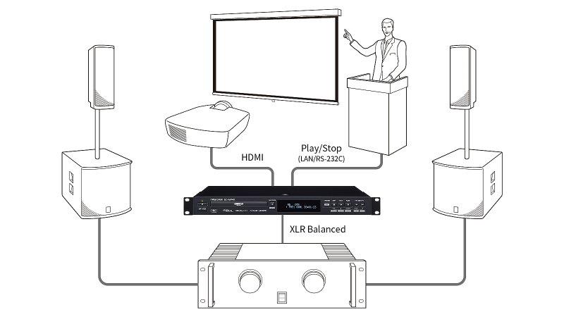 BD-MP4K er en professionel 4K7UHD multimedie-videoafspiller med én rack-plads til professionelle applikationer som permanent installation eller touring. Denne high-definition afspilningsenhed styres via LAN, RS-232C og en trådløs fjernbetjening og er derfor en ideel komponent i integrerede mediesystemer. Ikke desto mindre kan al menubetjening også styres med taster på frontpanelet. BD-MP1 kan bortset fra Blu-ray-diske, DVD og CD-medier afspille flere formater af lydfiler og stillbilleder, der er gemt på SD-kort eller USB-flashmedier.