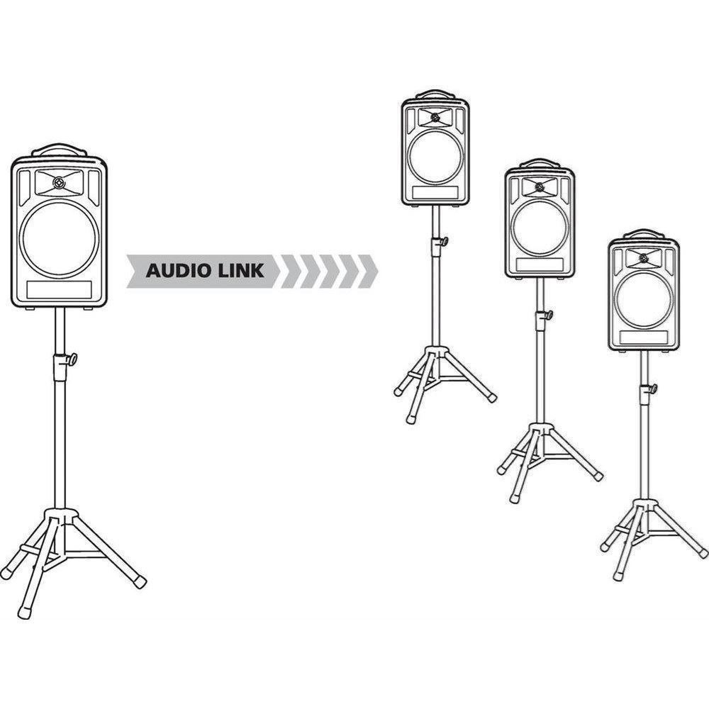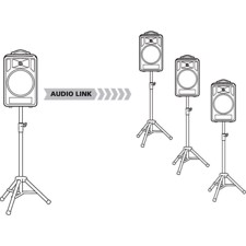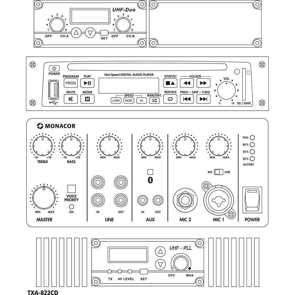 with integrated adjustable 2-channel multifrequency receiver unit with UHF PLL technology and Bluetooth receiver.