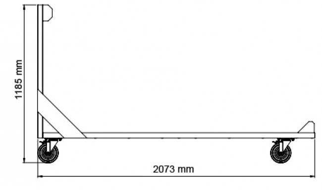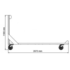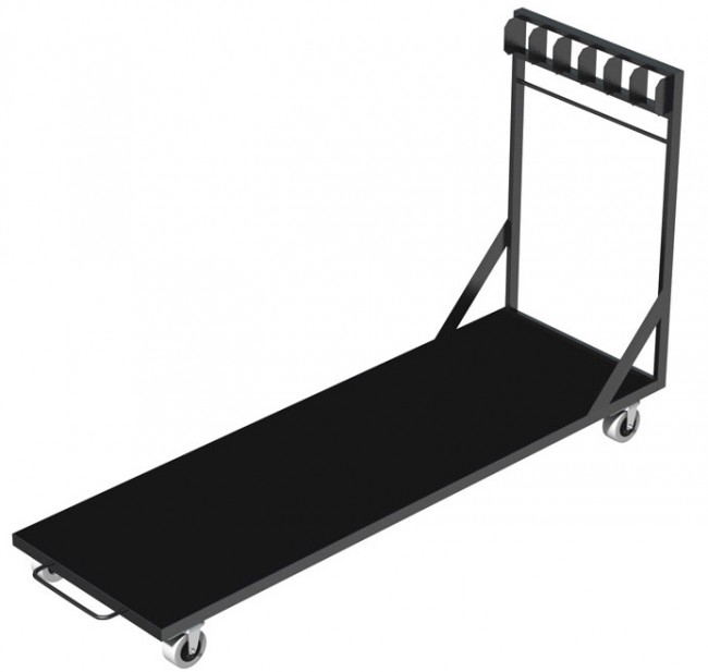 Denne transportvogn er designet til at rumme op til 6 scenepodier, der står lodret, og dens samlede mål er 119H x 61B x 207,5L cm.