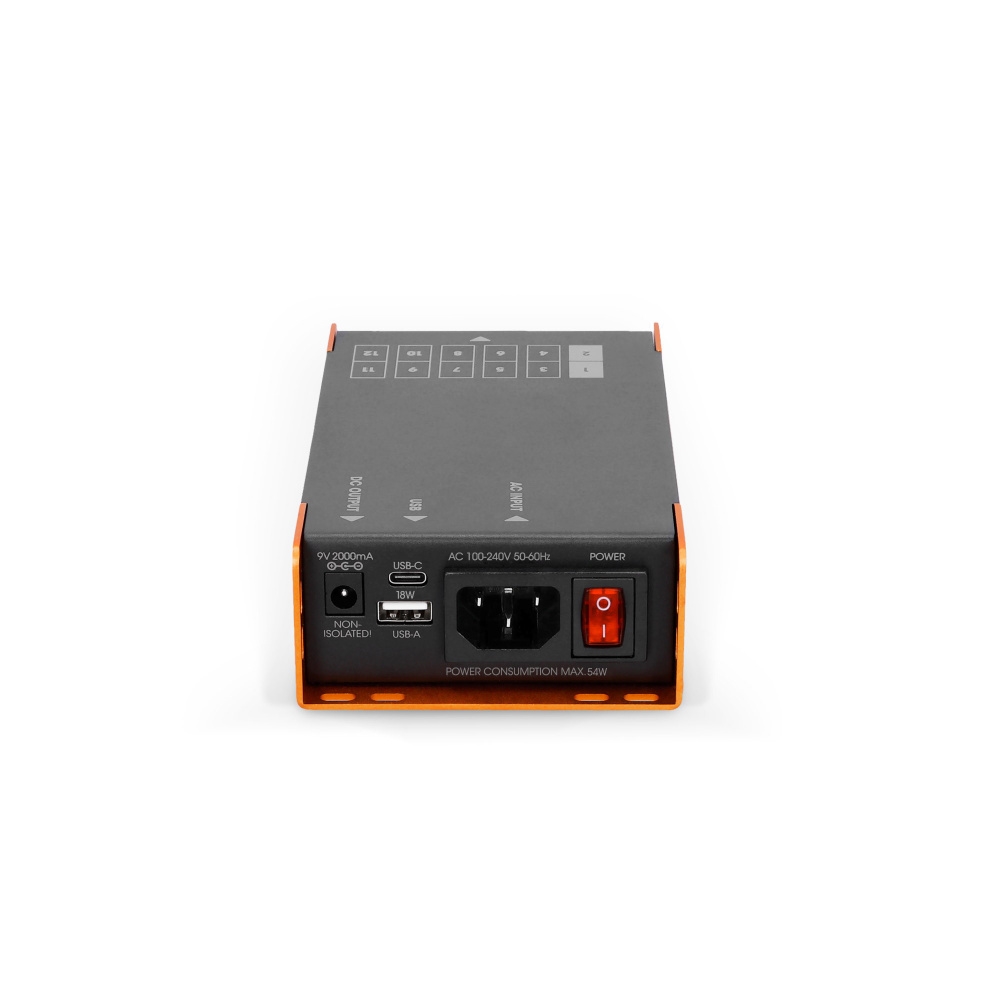 A pedalboard can be a noisy place, and choosing the right power supply can make a big difference to the noise level and clarity of your guitar tone. That's where the PWT 12 IEC comes in. With 12 high current, individually isolated, ultra low noise outputs - each with its own dedicated regulator and custom isolated transformer - the PWT 12 IEC represents the next generation of Palmer® isolated pedal power supplies. Featuring two variable voltage outputs, the PWT 12 IEC lets you adjust the voltage between 6 and 18 volts, giving you even more headroom to run your overdrive pedals, as well as the "dying battery" sound that many guitarists love.In addition, the Palmer PWT 12 IEC has a USB C and USB A output with 18W so you can charge your mobile devices or even power your MIDI keyboards. We designed the PWT 12 IEC to address guitarists' main pain points when it comes to powering their precious effects pedals, so you can perform with complete peace of mind, so you can perform with complete peace of mind, knowing that your pedals and rig will sound as good as they can.