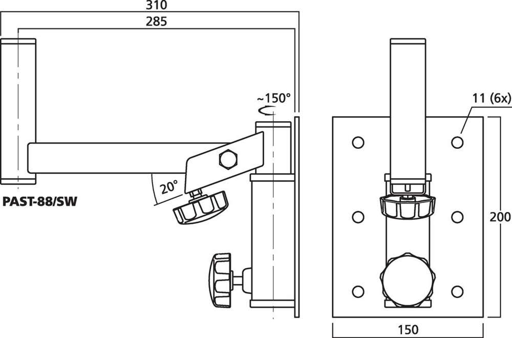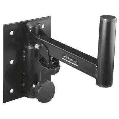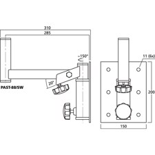 Vægbeslag til PA højttalersystemer, sortlakeret, justerbart, horisontalt ca. 150° og vertikalt ca. 20°, med justeringsskrue. Til montering af fx PA højttalersystem med stativflange samt bære- og adapterplader. Afstand mellem holder og monteringsplade: 285 mm, total længde: 310 mm. Maksimal kapacitet: 20 kg.