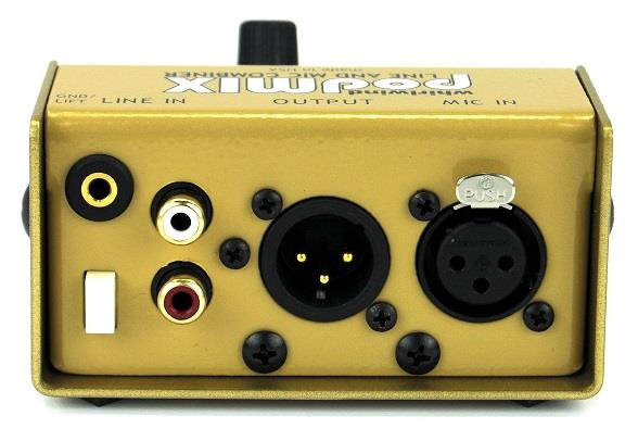 Accepts the stereo line inputs via 1/8" stereo jack or dual RCA phono jacks, reduces them to mic level and sums them with the microphone into a single balanced mono output. These are wired in parallel and can be used as a loop thru from one to the other.