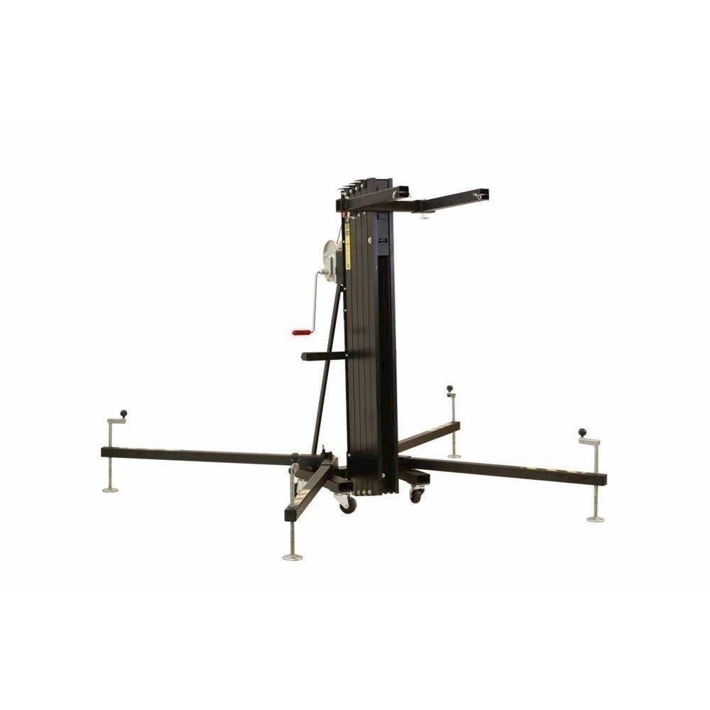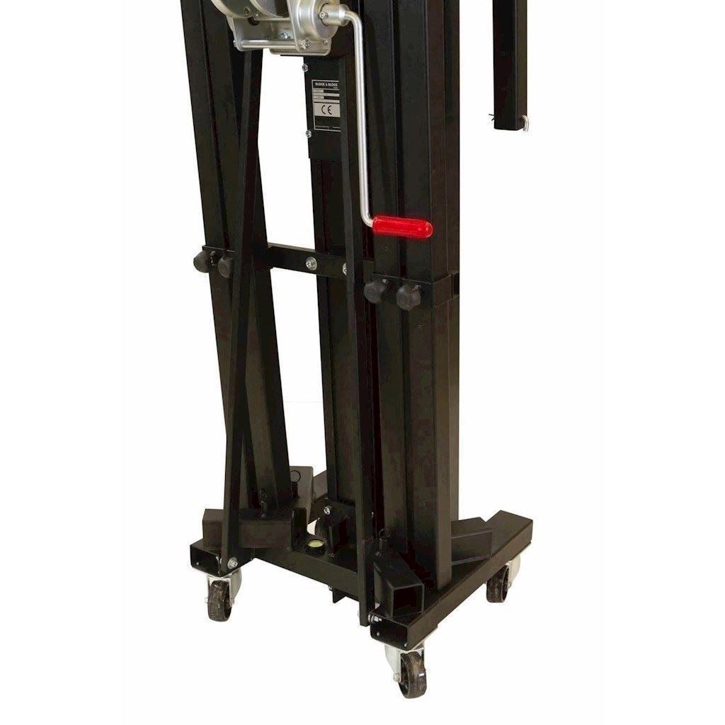 Kompakt men højtløftende frontloaded wind-up stativ til truss mv. Hele 6,25 meter kan dette staiv hejses op i, på trods af sin beskedne størrelse på 159 cm. i sammenklappet tilstand. Og det kan belastes med op til 200 kg.